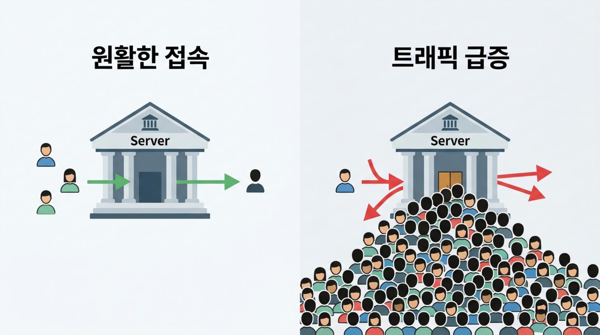 아주 유명한 맛집이 있다고 상상해 보세요. 평소에는 10개의 테이블로도 충분히 손님을 맞이할 수 있습니다. 그런데 갑자기 유명 방송에 소개되면서 수백 명의 손님이 한꺼번에 몰려들면 어떻게 될까요? 식당 입구는 마비되고, 주방은 주문을 감당하지 못해 결국 ‘재료 소진’ 팻말을 걸고 일찍 문을 닫아야 할 겁니다.