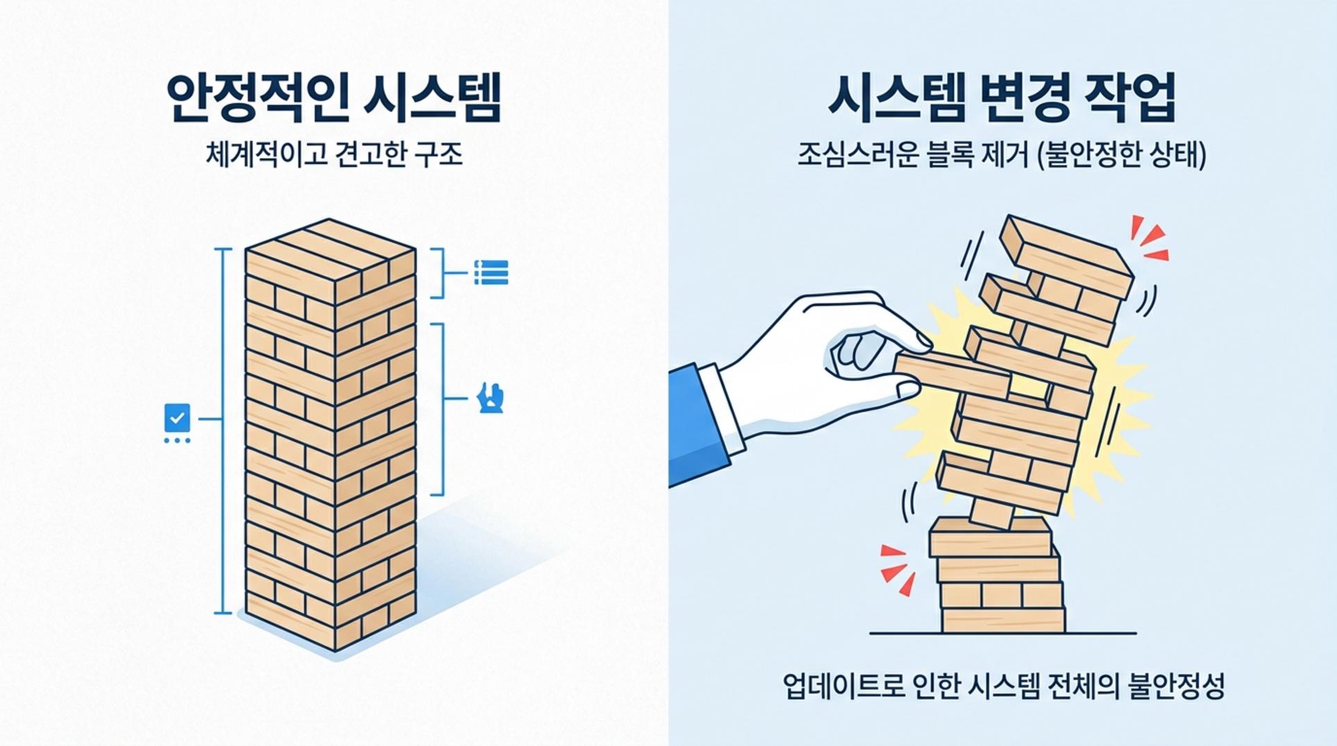 은행들은 더 나은 서비스를 위해 끊임없이 앱을 업데이트하고 내부 시스템을 개선합니다. 이건 마치 달리는 자동차의 엔진을 정비하거나 부품을 교체하는 것과 같이 매우 섬세하고 위험한 작업입니다. 아주 작은 나사 하나를 잘못 조이거나, 기존 부품과 맞지 않는 새 부품을 끼우면 잘 달리던 자동차가 갑자기 도로 한복판에 멈춰 설 수 있습니다. 최근 카카오뱅크 사태에서 ‘내부 시스템 변경 과정에서 프로그램 충돌’이 원인이었던 것처럼, 새로운 기능을 추가하거나 보안을 강화하는 과정에서 얘기치 못한 오류가 발생해 시스템 전체가 마비되기도 합니다.