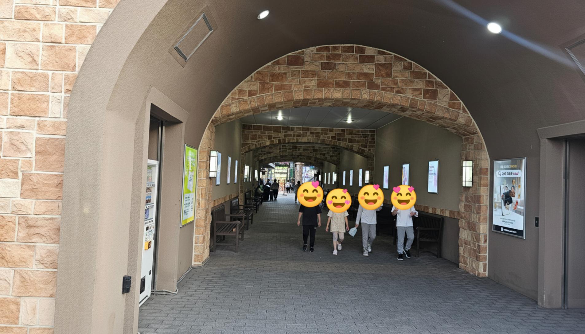 입구를 지나 안으로 들어서자마자 마주친 풍경이에요. 마치 유럽의 어느 고성 안쪽을 걷는 듯한 아치형 통로가 눈앞에 펼쳐졌어요. 붉은 벽돌과 은은한 조명이 어우러져 정말 이국적인 분위기를 자아냈어요. 쇼핑을 시작하기도 전에 벌써부터 기분이 좋아지더라고요.