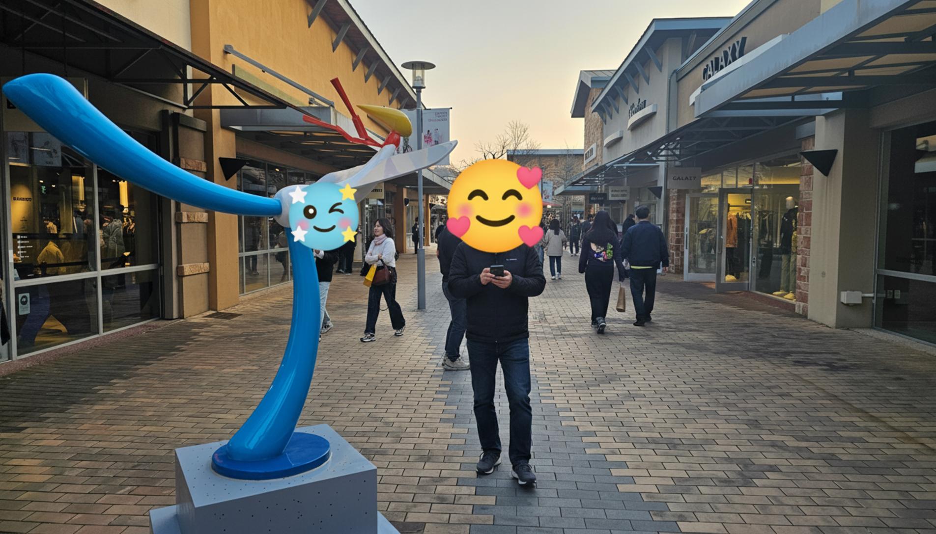 여주 아울렛의 매력은 단순히 쇼핑만 하는 공간이 아니라는 점이에요. 걷다 보면 이렇게 독특한 현대 미술 조형물도 만날 수 있어요. 버버리 같은 클래식한 브랜드 매장 옆에 놓인 감각적인 조형물이 꽤나 인상적인 조화를 이루었어요. 덕분에 눈이 심심할 틈이 없었죠.