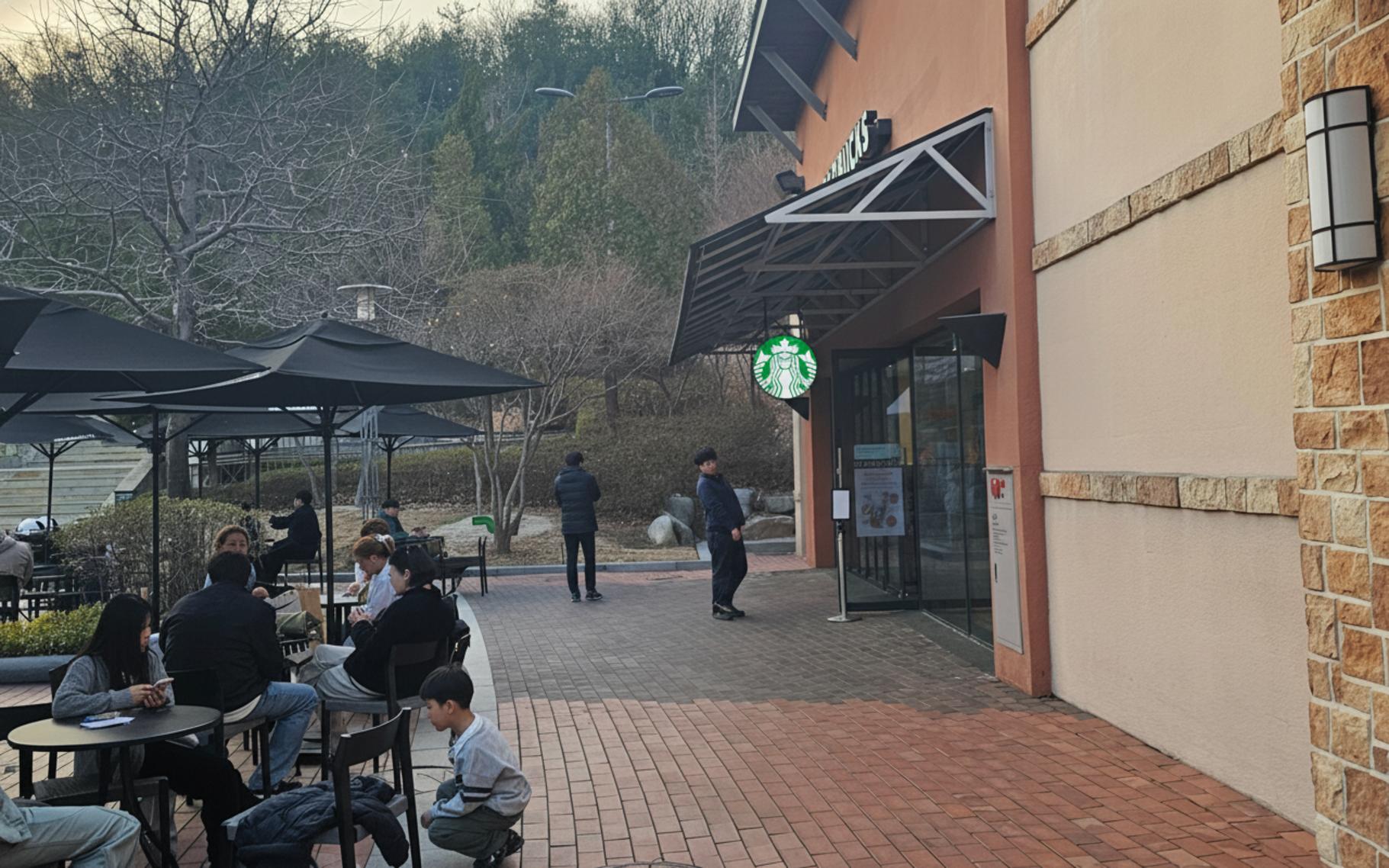 양손 가득 쇼핑백을 들고 나니 다리도 아프고 카페인이 간절해졌어요. 마무리는 역시 스타벅스죠. 이국적인 분위기의 건물과 야외 테라스가 있는 스타벅스는 완벽한 휴식처였어요. 따스한 조명이 켜진 테라스에 앉아 시원한 커피를 마시며 오늘 하루를 돌아보는 시간. 이보다 더 좋을 순 없겠죠.