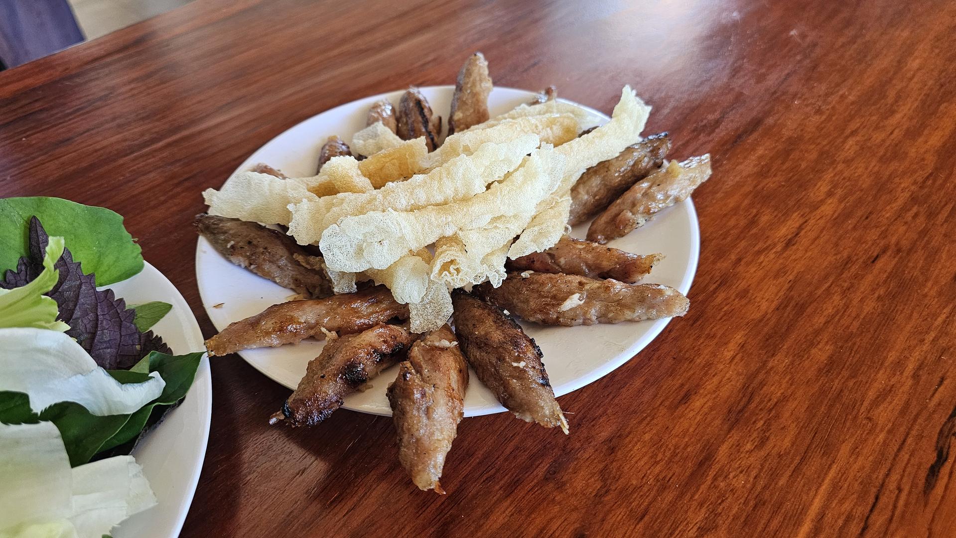 메인 접시에는 숯불 향을 가득 머금은 돼지고기 소시지와 구름처럼 바삭하게 튀겨낸 라이스페이퍼가 함께 나왔어요. 노릇노릇하게 구워진 고기에서는 은은한 불향이 올라와 식욕을 계속 자극하더라고요. 그냥 하나만 집어 먹고 싶을 정도였어요.