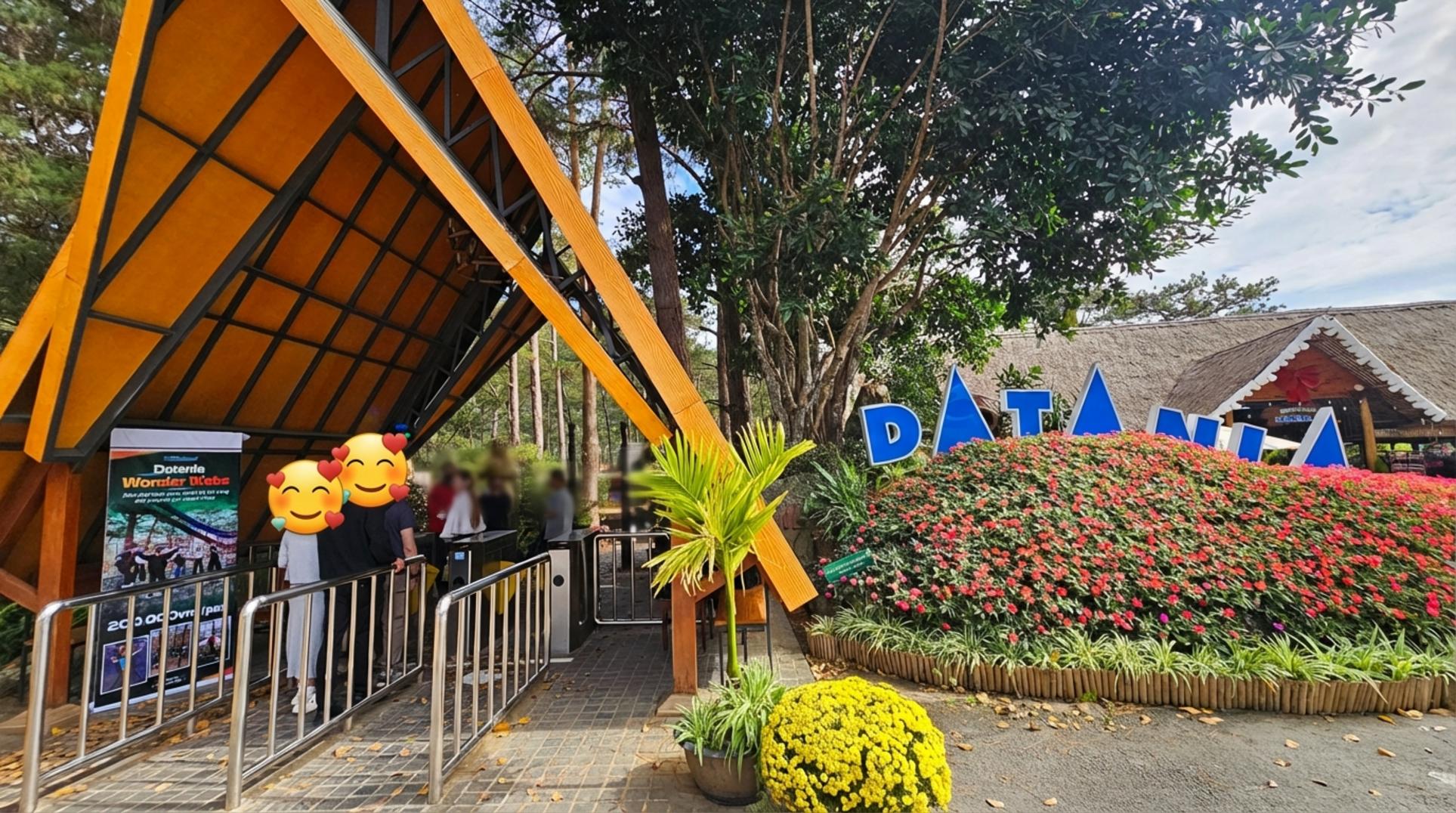 레스토랑을 지나 조금 더 걸으니, 선명한 파란색의 ‘DATANLA’ 사인이 알록달록한 꽃밭과 함께 저를 반겨줬어요. ‘꽃의 도시’ 달랏답게 입구부터 화사한 에너지로 가득 차 있었죠. 저 사인 앞에서 사진 한 장 남기는 건 이제 필수 코스가 된 것 같아요. 이 문을 지나면 어떤 풍경이 기다리고 있을지, 심장이 두근거리기 시작했어요.