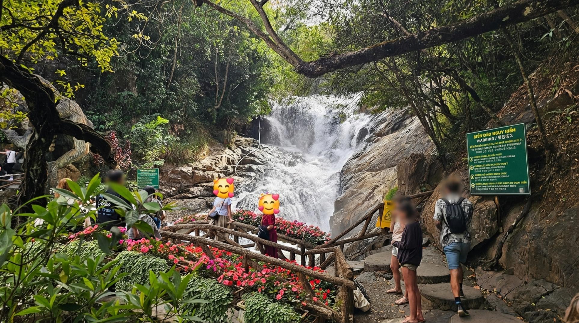 달랏 여행 중 가장 기대했던 곳 중 하나인 다딴라 폭포로 향했죠. 입구에 도착하자마자 커다란 리본을 단 이국적인 지붕의 건물이 시선을 사로잡았어요. 마치 동화 속 한 장면에 들어온 것 같은 기분이 들더라고요. 본격적인 탐험에 앞서 잠시 숨을 고르기에도, 여행의 설렘을 담은 사진을 남기기에도 더할 나위 없이 좋은 장소였어요.