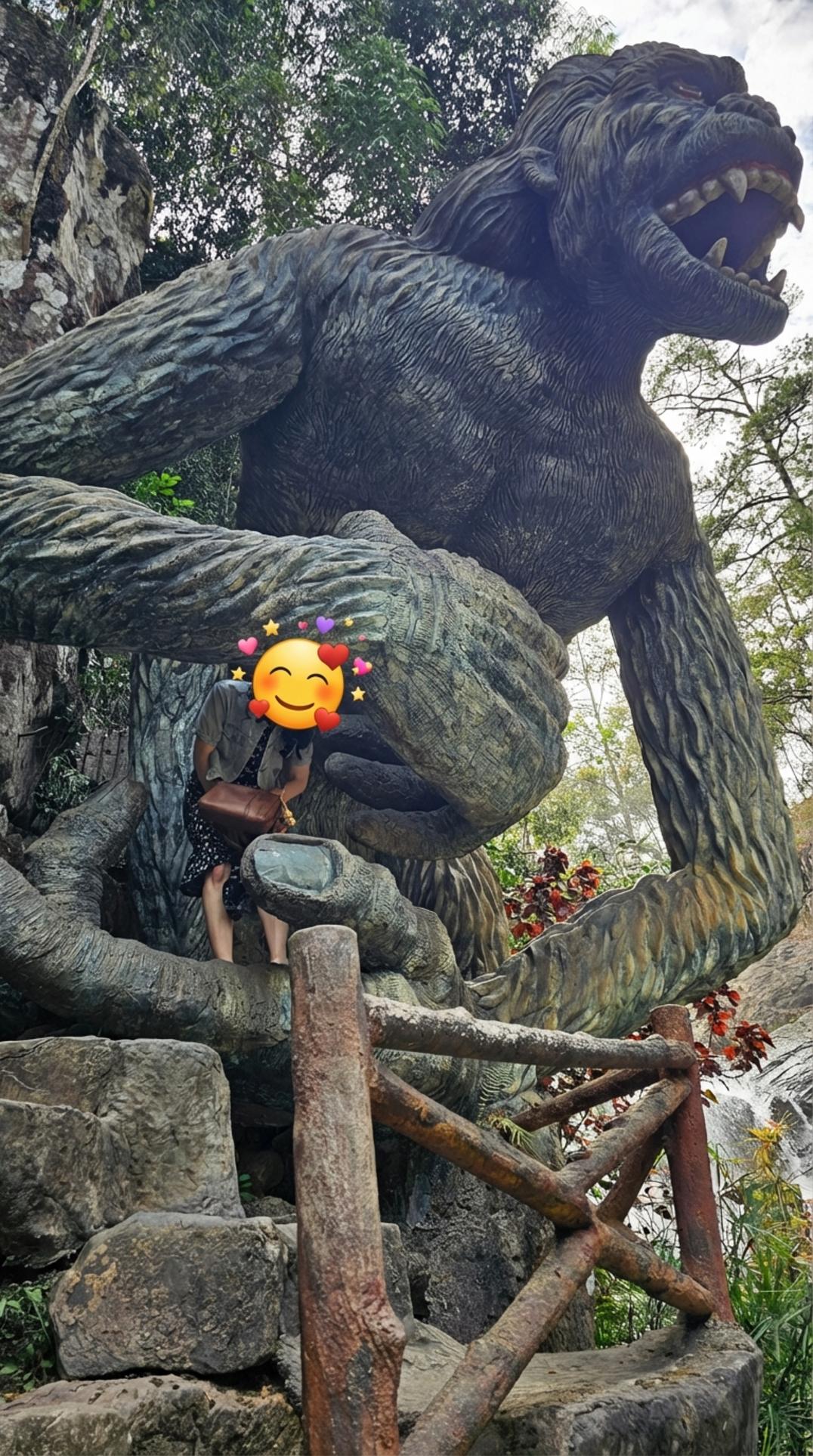 폭포의 감동을 뒤로하고 주변을 산책하다 정말 예상치 못한 존재와 마주쳤어요. 바로 숲속에 숨어있던 거대한 킹콩 조형물이었죠. 압도적인 크기와 리얼한 표정에 잠시 놀랐지만, 이내 이곳이 다딴라 폭포 최고의 포토존이라는 걸 직감했어요. 킹콩의 커다란 손바닥 위에 올라가 사진을 찍는 경험은 정말 특별하고 재미있었어요.