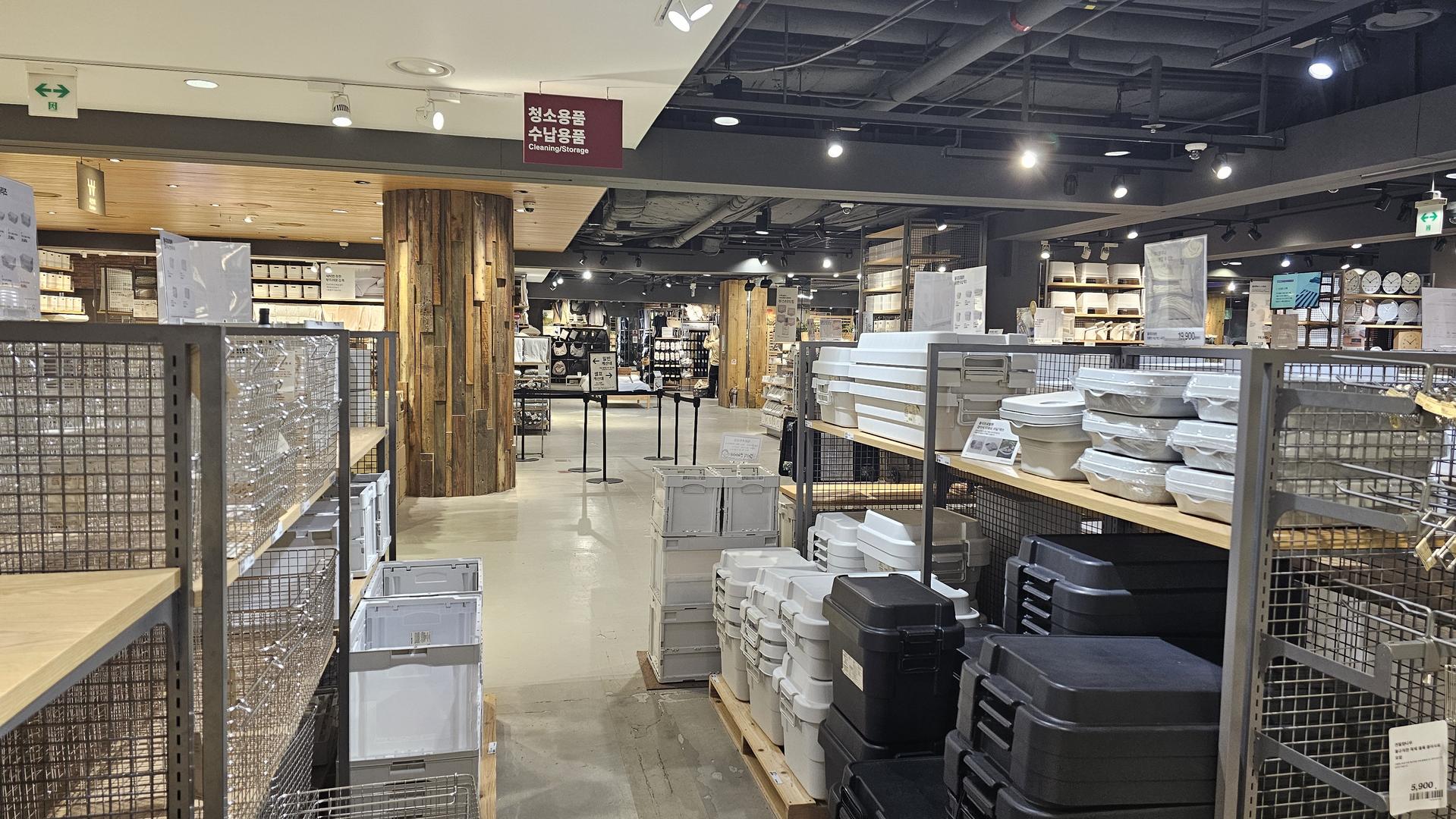 커피 한 잔을 들고 다시 구경에 나섰어요. 아까 스치듯 지나쳤던 무인양품을 좀 더 자세히 둘러보기로 했죠. 역시나 무인양품 특유의 정갈하고 미니멀한 디스플레이는 보고만 있어도 마음이 편안해져요. 저 수납함들을 다 사면 우리 집도 이렇게 깔끔해질까, 잠시 행복한 상상을 해봤습니다.