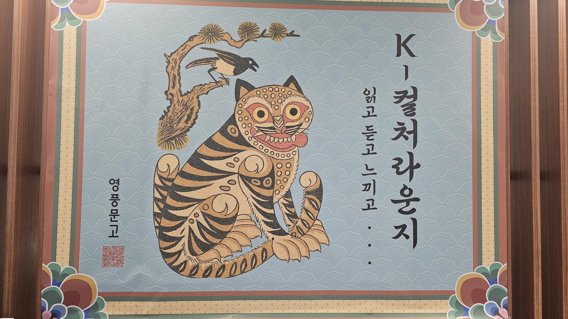 새로운 발견은 여기서 그치지 않았어요. 무인양품 한쪽 벽면에서 K-컬처라운지를 알리는 멋진 포스터를 발견한 거예요. 전통 민화 속 호랑이를 현대적으로 재해석한 일러스트가 정말 인상적이었어요. 책과 문구, 라이프스타일 샵을 넘어 이제는 K-컬처까지 품는 공간으로 진화하고 있구나 싶었어요.