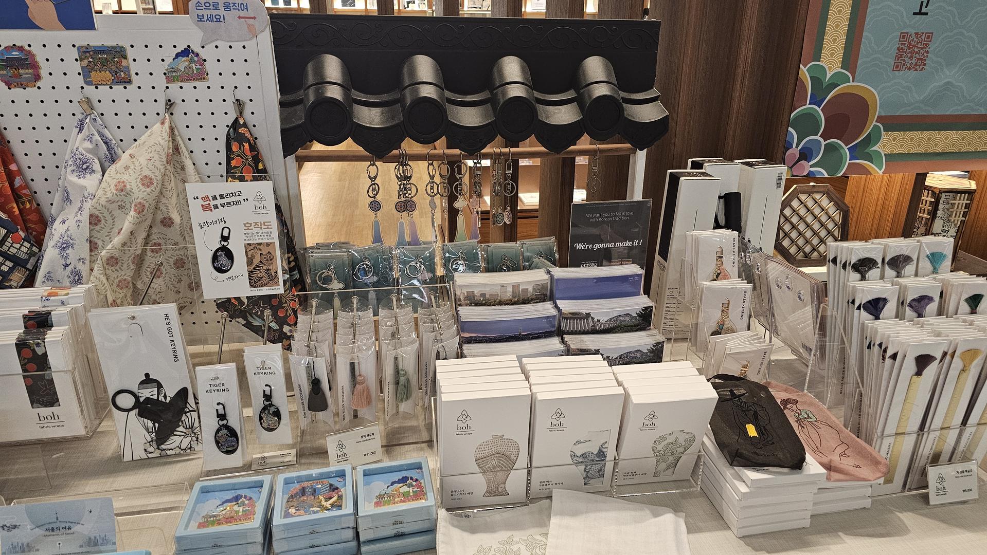 이런 한국적인 미에 꽂혀서였을까요? 근처 한국관광공사에서 운영하는 ‘하이커 그라운드’에도 잠시 들렀는데, 거기서 만난 전통 굿즈 브랜드 ‘보(BOH)’의 제품들이 정말 예뻤어요. 전통 문양을 세련되게 풀어낸 소품들이 많아서 외국인 친구가 있다면 꼭 데려오고 싶은 곳이었어요.