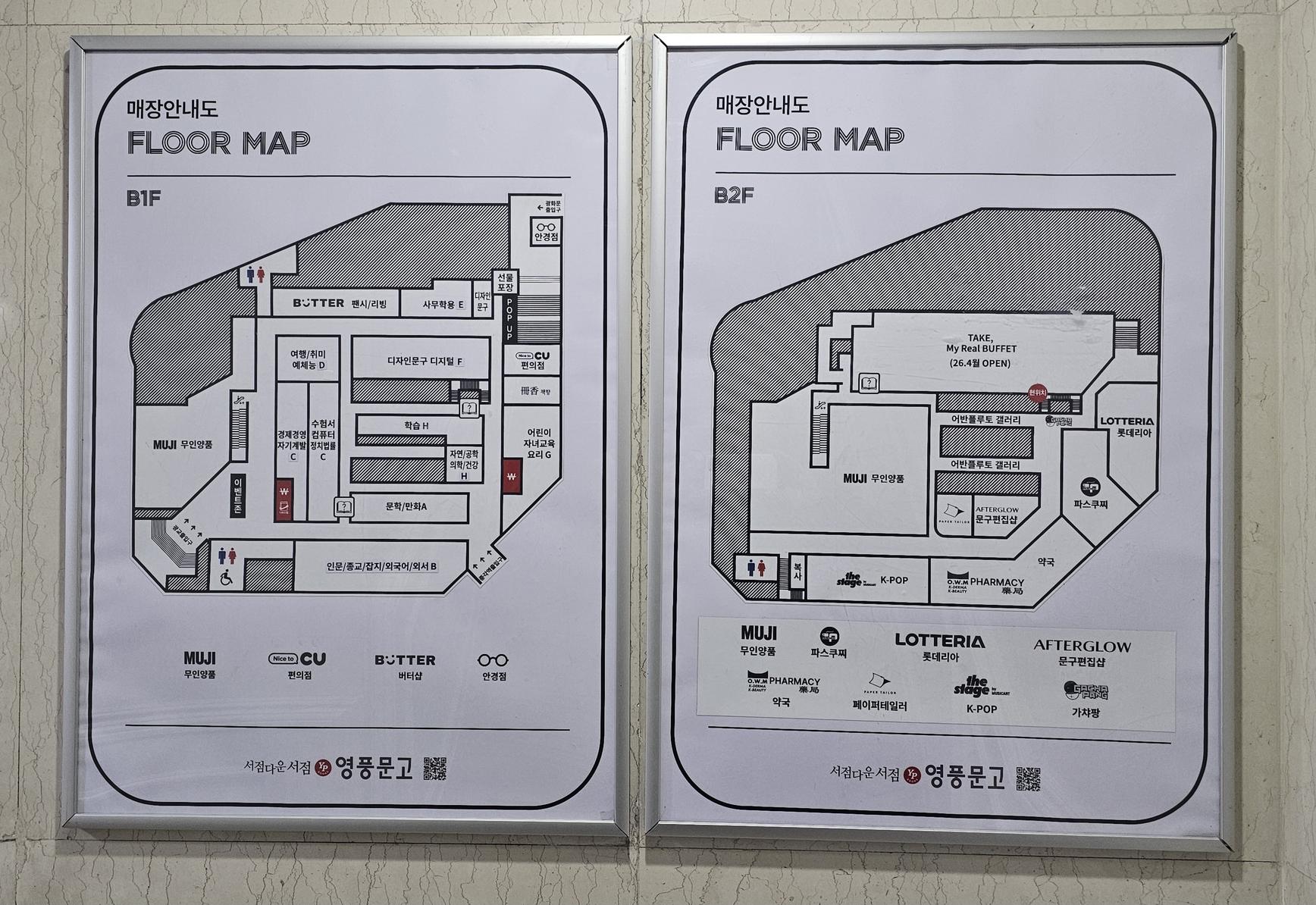 짧은 시간이었지만 정말 많은 것을 보고 경험한 것 같아요. 서점을 나서기 전, 무심코 보게 된 층별 안내도를 보고 다시 한번 놀랐어요. 제가 둘러본 곳들 외에도 정말 다양한 매장들이 지하 1, 2층에 빼곡하게 들어차 있더라고요.