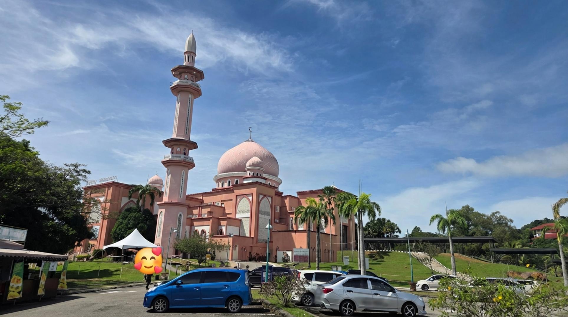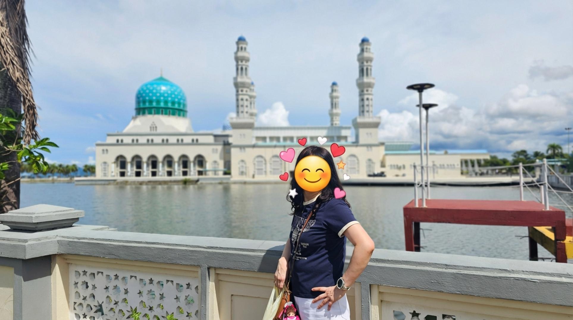 핑크빛 감성에 푹 빠져있다가, 이번엔 코타키나발루의 또 다른 상징, 블루 모스크로 향했어요. 핑크 모스크와는 또 다른 매력이 있더라고요. 마치 물 위에 떠 있는 듯한 신비로운 모습이 정말 인상적이었어요. 푸른 돔과 하얀 외벽의 조화가 시원하고 청량한 느낌을 줬어요.