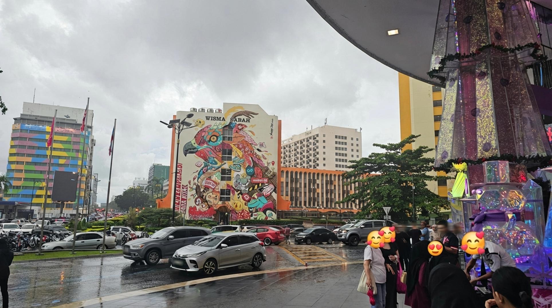 쇼핑을 마치고 나오니 어느새 비가 조금씩 내리고 있었어요. 하지만 비에 젖은 거리가 또 다른 운치를 만들어주더라고요. 비스마 사바 건물의 거대한 새 벽화가 빗물에 젖어 유난히 더 선명해 보였어요.