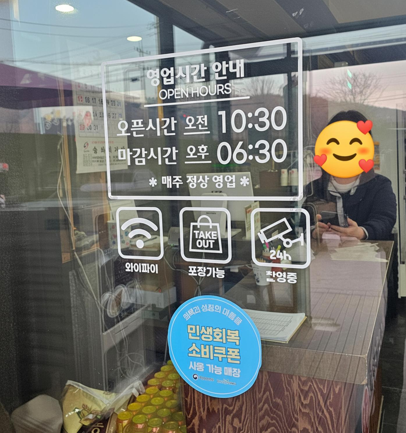 가게에 들어서기 전, 유리문에 붙은 영업시간 안내가 먼저 저를 맞이했어요. 화려하진 않지만 정직하게 쓰인 글씨에서부터 괜히 믿음이 갔어요. 포장도 되고, 와이파이도 된다니. 사소하지만 손님을 위한 배려가 느껴지는 부분이었죠.