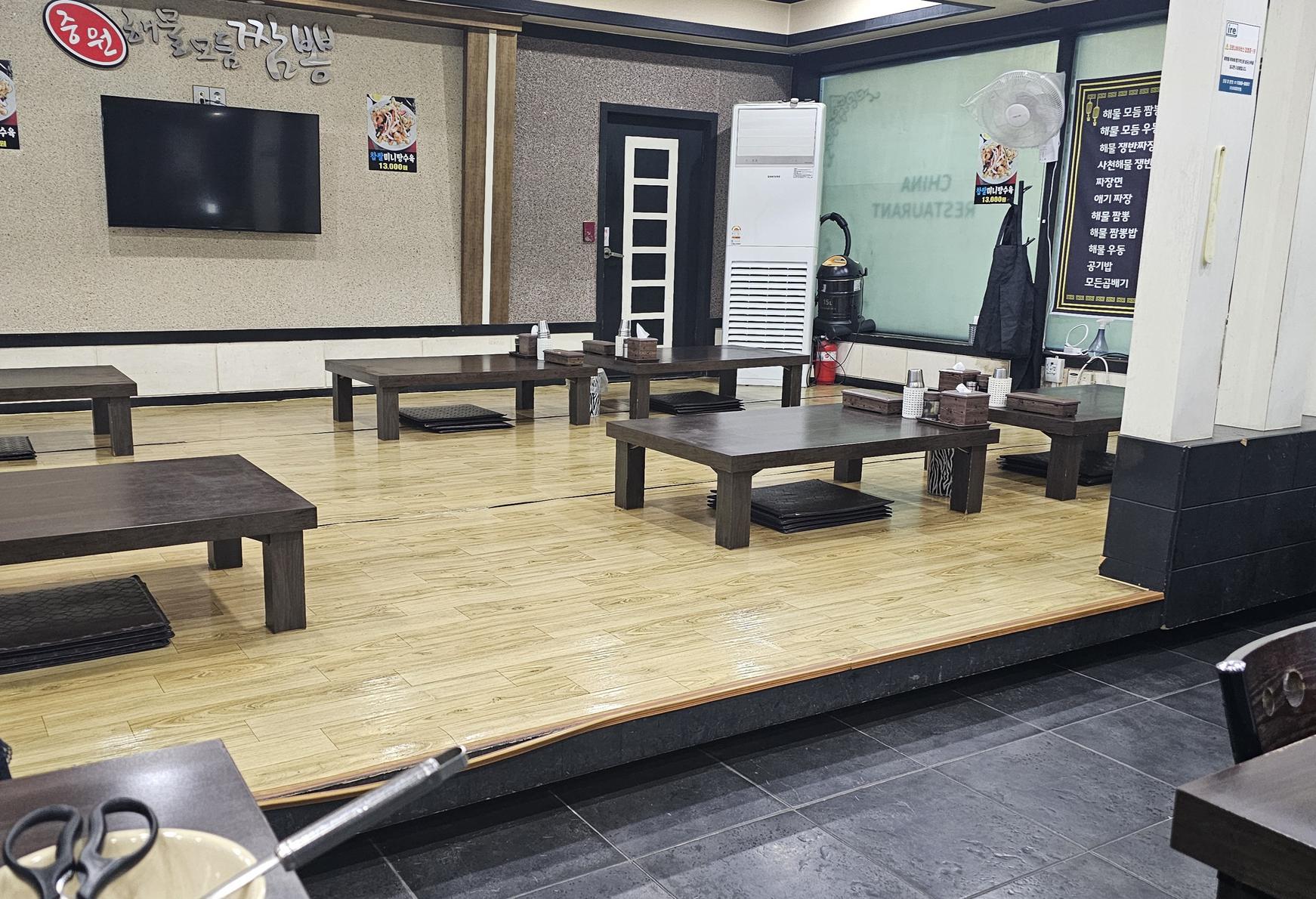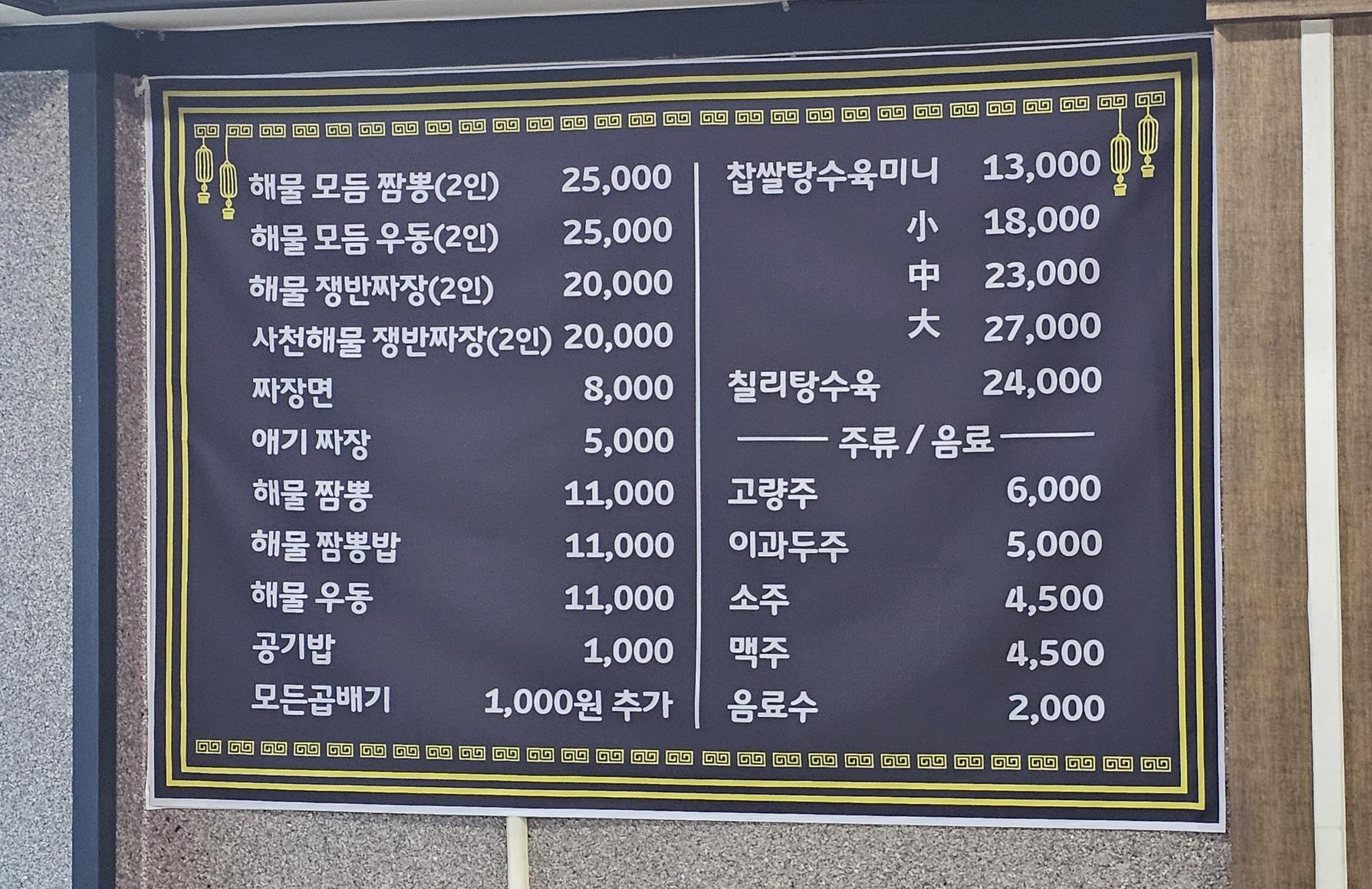 자리에 앉아 메뉴판을 찬찬히 살펴봤어요. 짙은 남색 배경에 흰 글씨로 깔끔하게 정리된 메뉴들이 한눈에 쏙 들어왔어요. 다들 이걸 꼭 시키길래 저도 따라 해봐야겠다 싶었죠. 해물 짬뽕과 찹쌀 탕수육, 그리고 기본인 짜장면까지. 오늘은 작정하고 먹기로 마음먹었습니다.