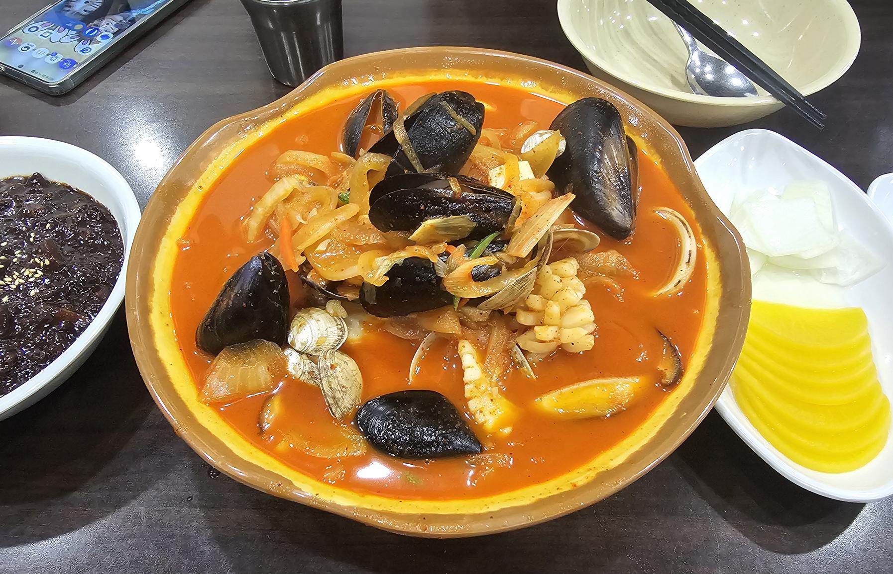 국물부터 한 숟갈 떠먹었는데, ‘크’ 소리가 절로 나왔어요. 인위적인 매운맛이 아니라, 신선한 재료들이 어우러져 만들어낸 깊고 시원한 칼칼함이었어요. 홍합, 오징어, 조개 등 해산물도 어찌나 푸짐하게 들어있던지. 리뷰에서 보던 것보다 양이 훨씬 많았어요.
