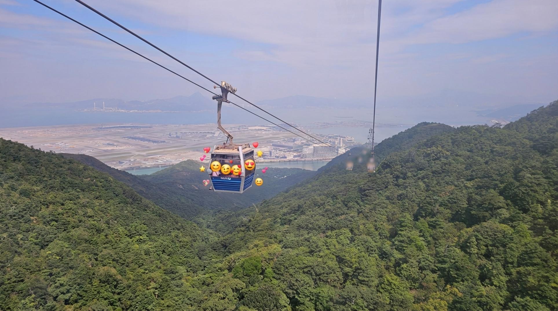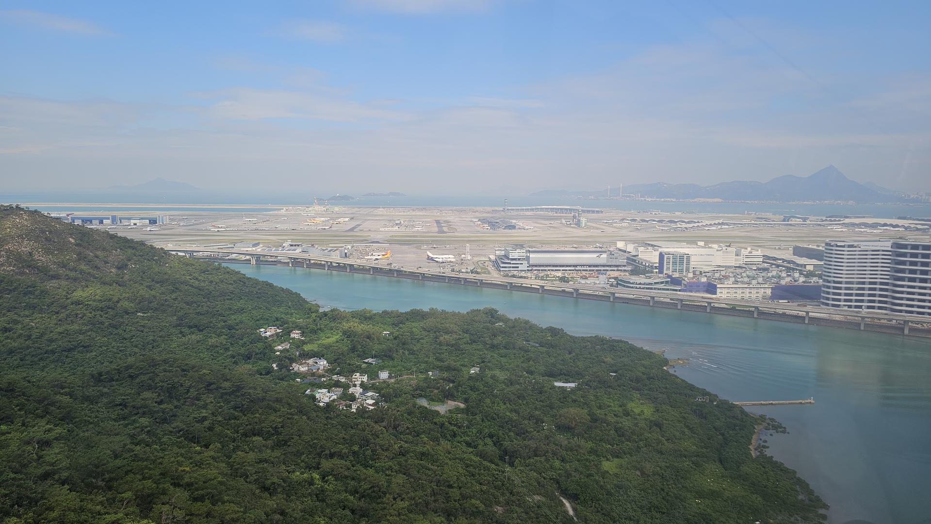 케이블카가 점점 고도를 높이자, 상상도 못 했던 장관이 눈앞에 나타났어요. 바로 드넓은 홍콩 국제공항의 전경이었죠. 짙은 녹음의 산자락 너머로 끊임없이 비행기가 뜨고 내리는 모습을 보니 가슴이 탁 트이는 기분이었어요.
