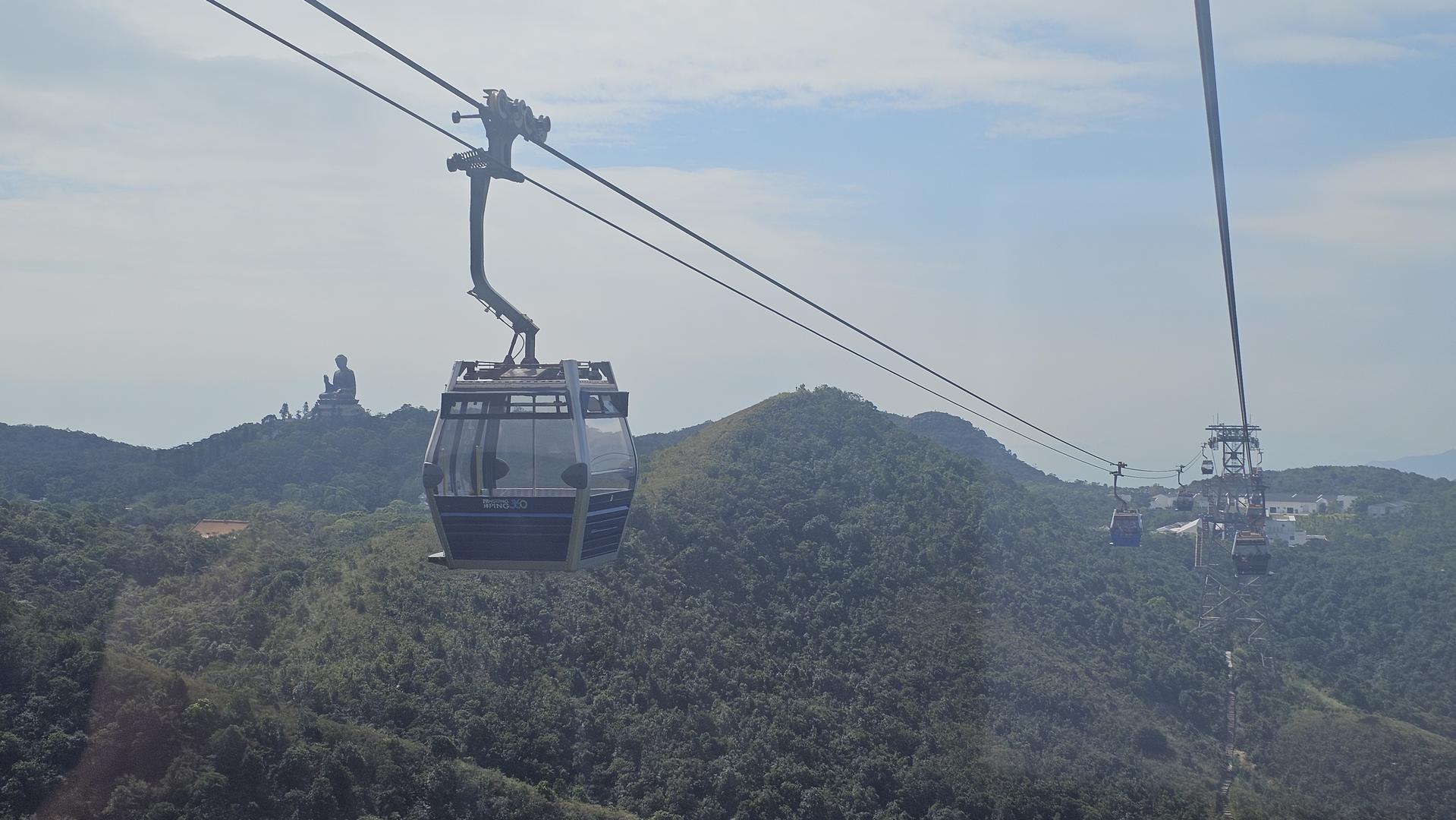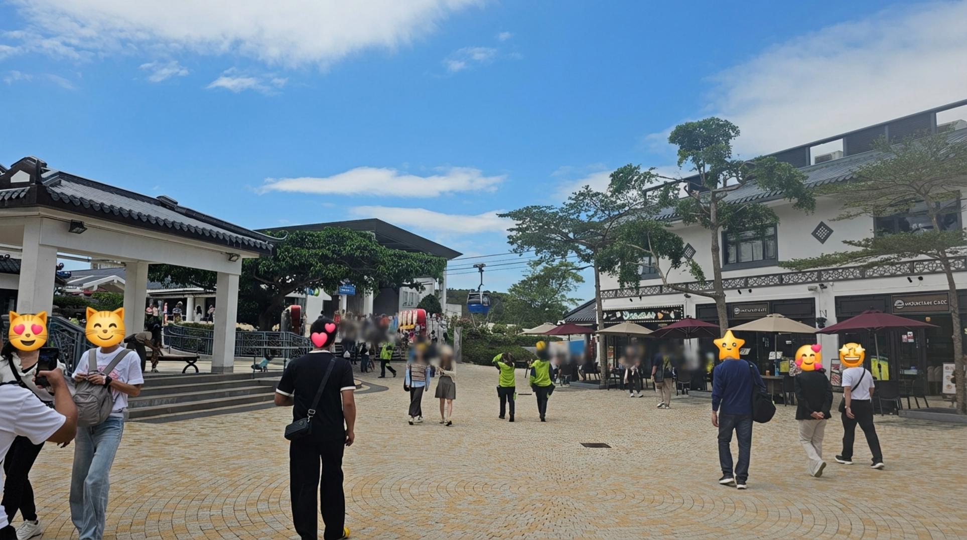 빅부다를 보고 내려와 땀도 식힐 겸 옹핑 빌리지를 다시 한번 둘러봤어요. 완벽하게 맑은 날씨 덕분에 어디서 사진을 찍어도 그림 같았죠. 저 멀리 케이블카가 지나가는 모습도 정겨웠어요.