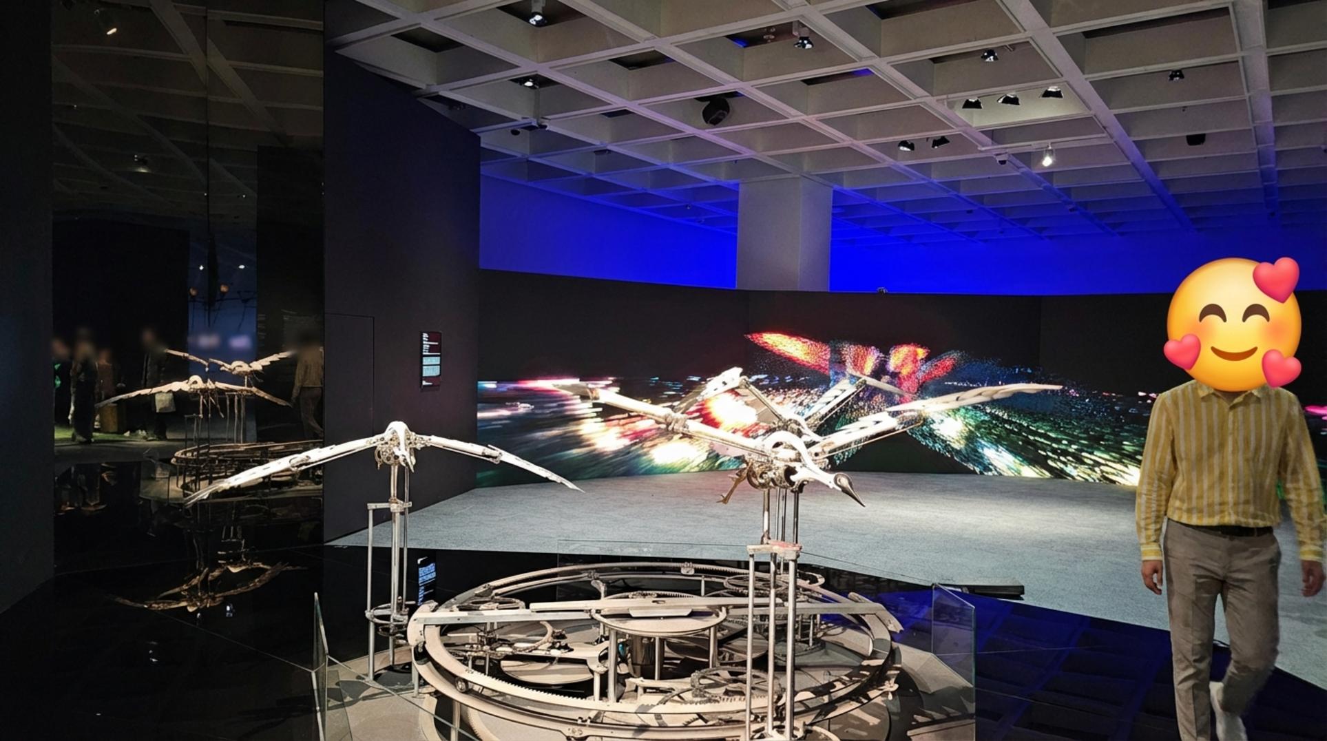 안쪽으로 들어서자 완전히 다른 세상이 펼쳐졌어요. 어두운 공간 속에서 화려한 조명과 함께 거대한 기계 새가 날갯짓을 하는 키네틱 아트는 그야말로 압도적이었어요. 정교한 톱니바퀴들이 맞물려 움직이는 모습을 보고 있으니, 차가운 금속 덩어리가 살아있는 생명체처럼 느껴지더라고요.