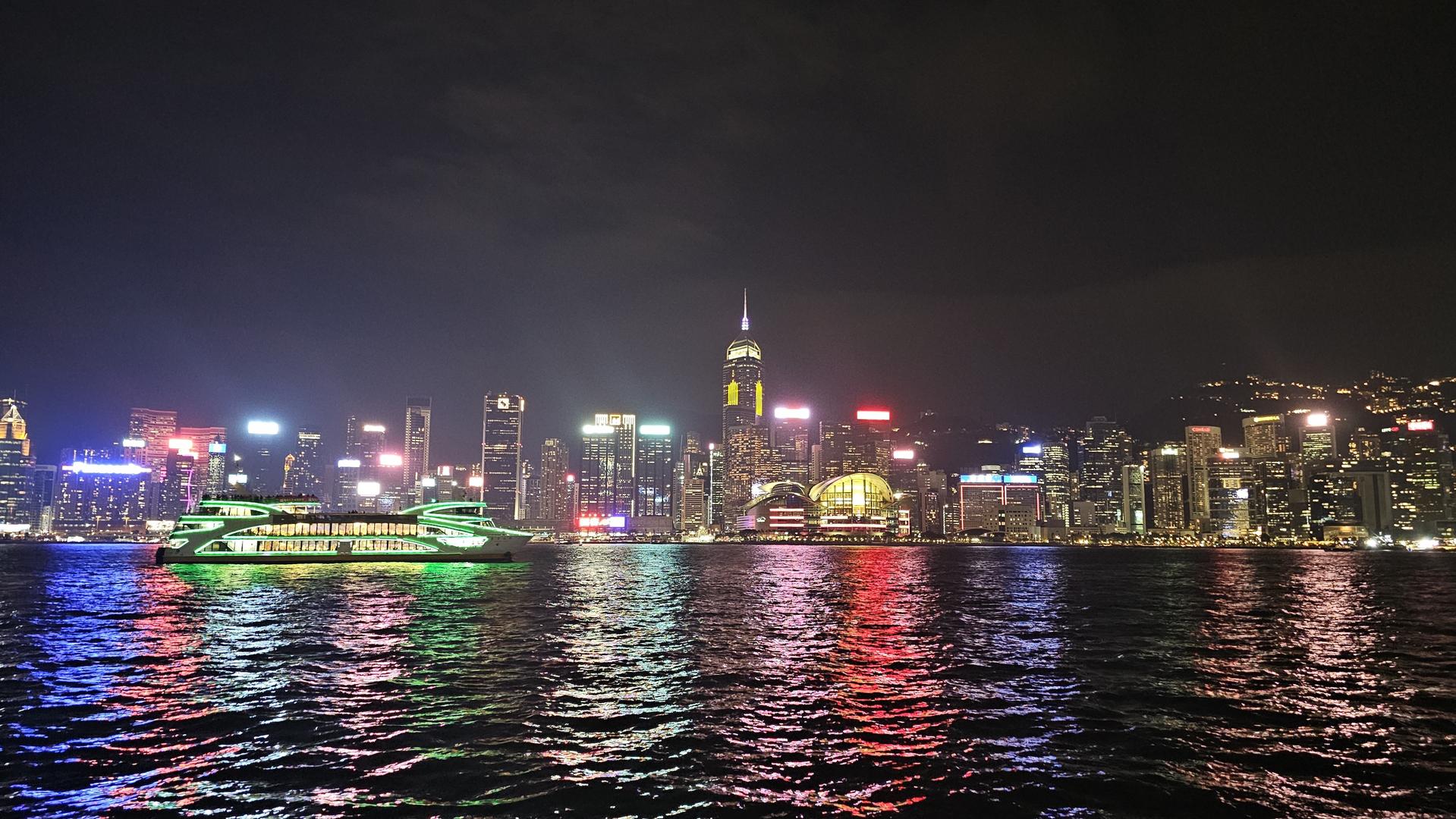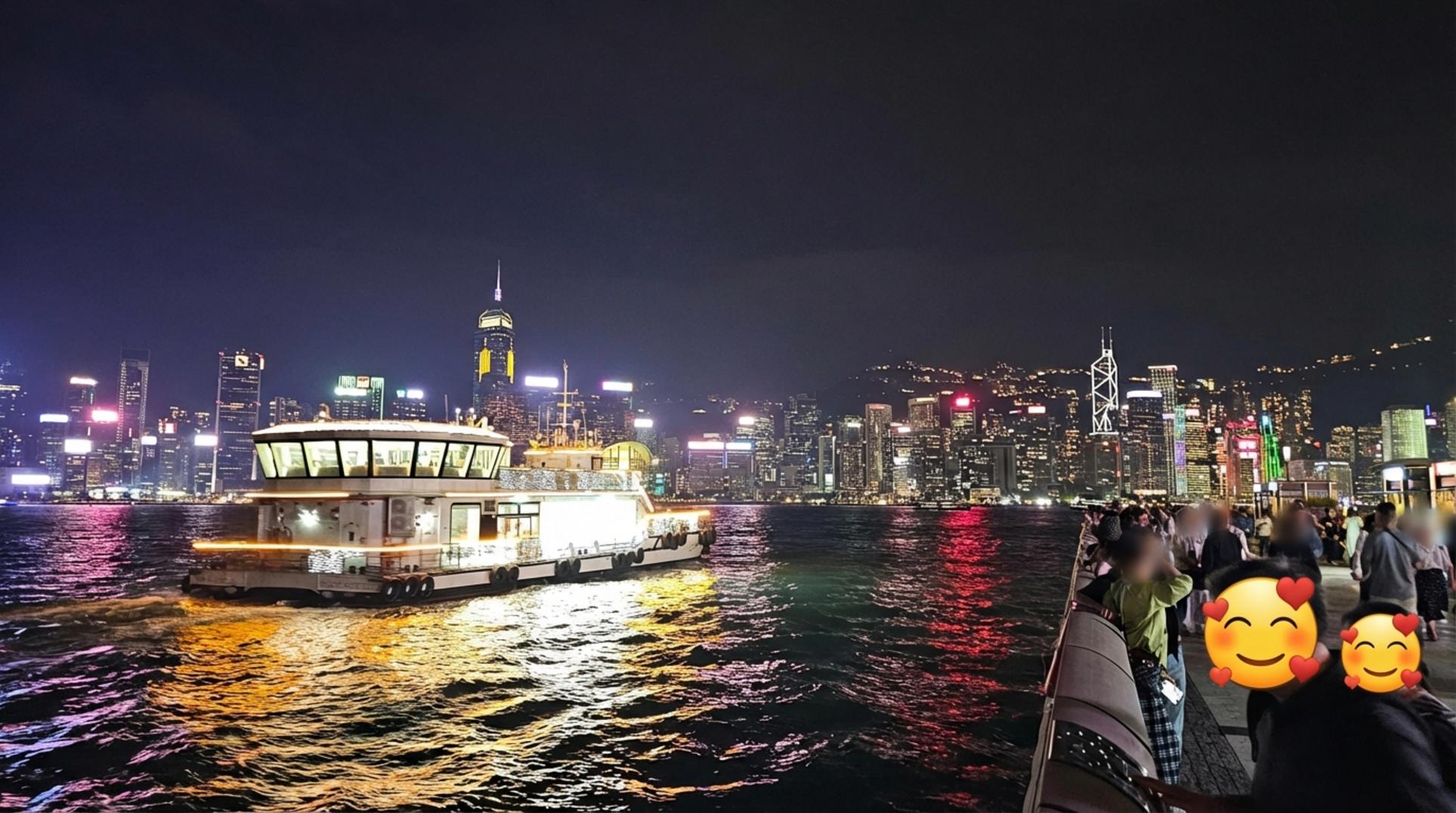 배를 든든하게 채우고는 홍콩 여행의 하이라이트, 빅토리아 하버의 야경을 보러 다시 침사추이 해변으로 향했어요. 어둠이 완전히 내려앉은 항구는 수많은 불빛으로 반짝이고 있었죠. 마침 커다란 유람선 한 척이 선착장에 들어오면서 야경은 더욱 화려해졌어요.