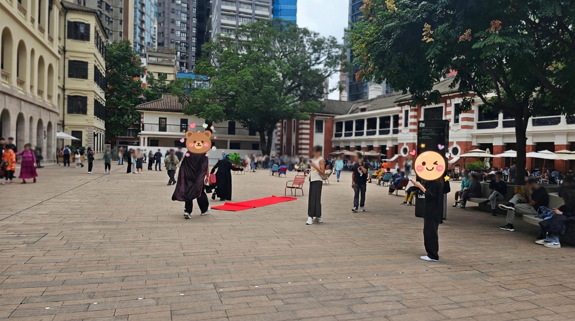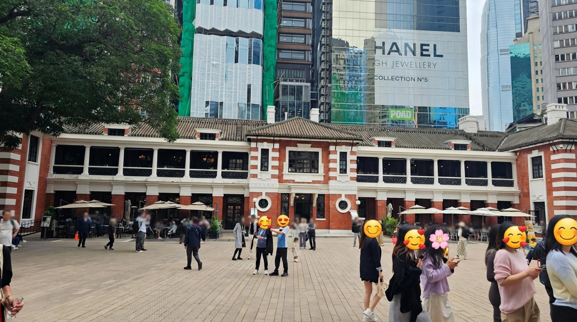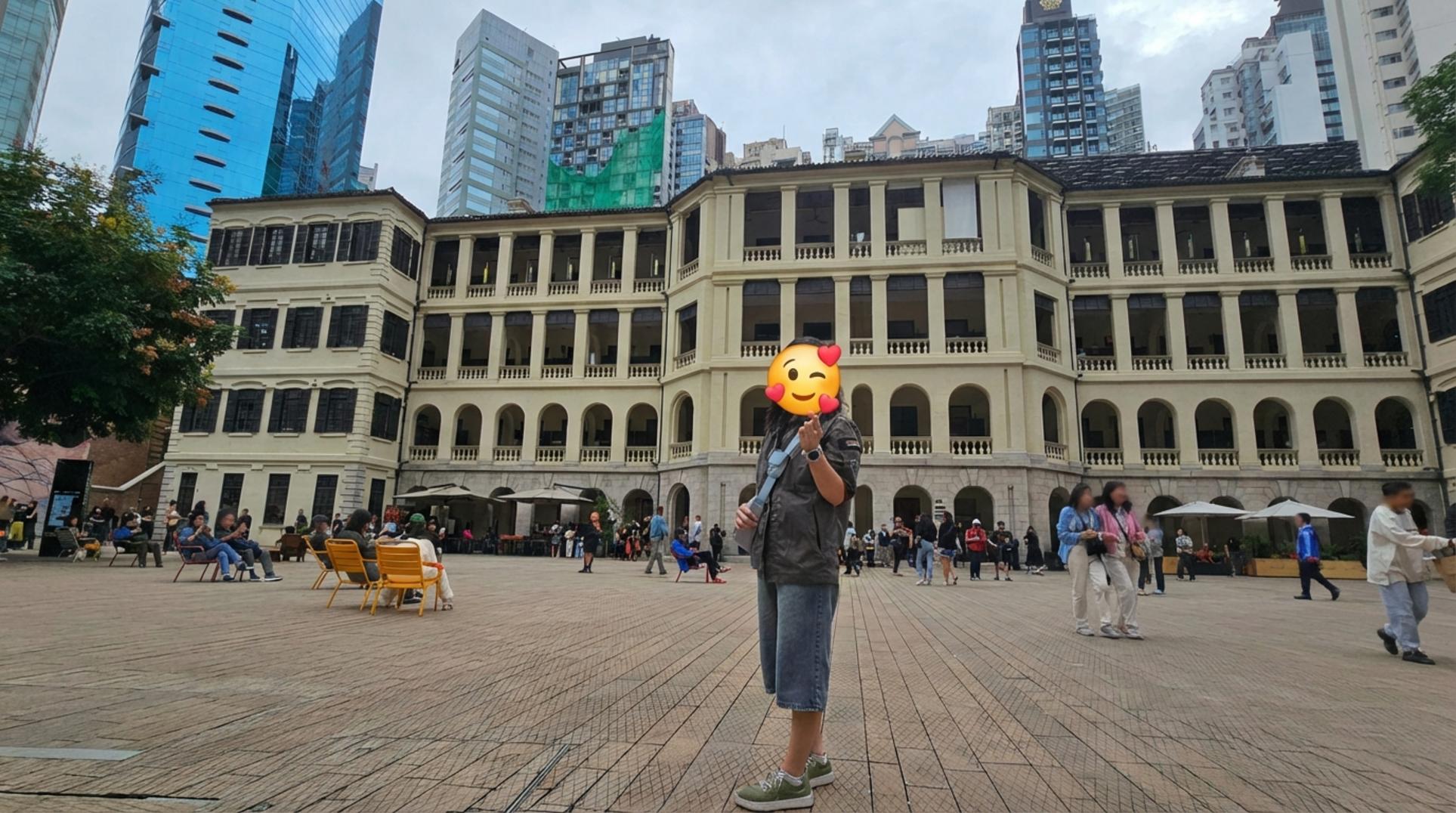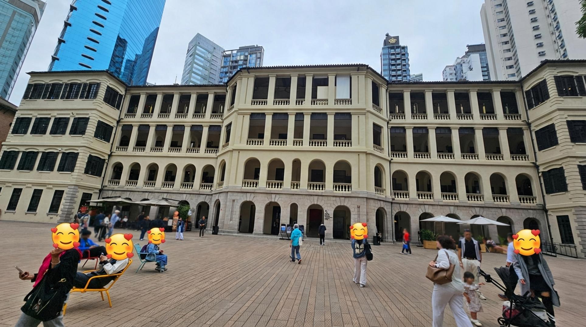 골목을 따라 조금 더 걷다 보니, 갑자기 시야가 탁 트이면서 거대한 광장이 나타났어요. 과거 홍콩 중앙 경찰서 부지를 개조해 만든 복합문화공간, 타이콴이었죠. 신고전주의 양식의 노란 건물과 그 너머로 보이는 현대적인 마천루의 대비가 정말 비현실적으로 느껴졌어요.