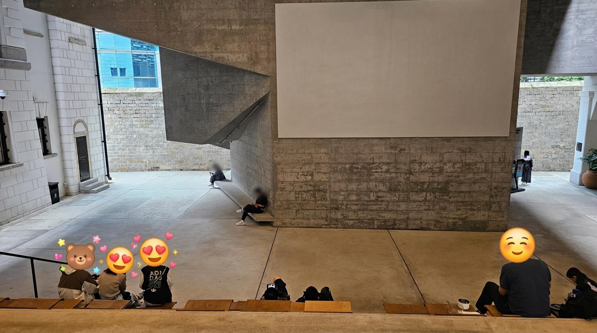 안쪽으로 더 들어가니 옛 감옥 부지를 재해석한 공간이 나왔어요. 웅장한 노출 콘크리트 벽과 거대한 스크린이 시선을 압도했어요. 계단에 잠시 앉아 이 공간이 품고 있는 역사와 현재의 감각을 동시에 느껴보는 시간을 가졌어요. 홍콩에서 가장 힙하게 ‘멍 때리기’ 좋은 장소가 아닐까 싶어요.