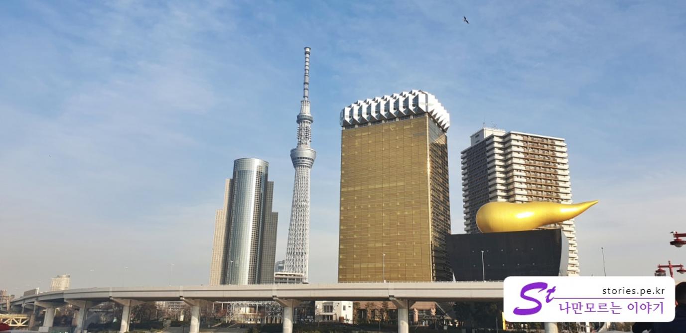 굉장히 눈에 띄는, 거품 모양이라고는 하는데 마치 황금 똥 같은 모양의 아사히 건물이 보이고 그 옆으로 커다란 스카이트리가 보이는 광경을 볼 수 있습니다.