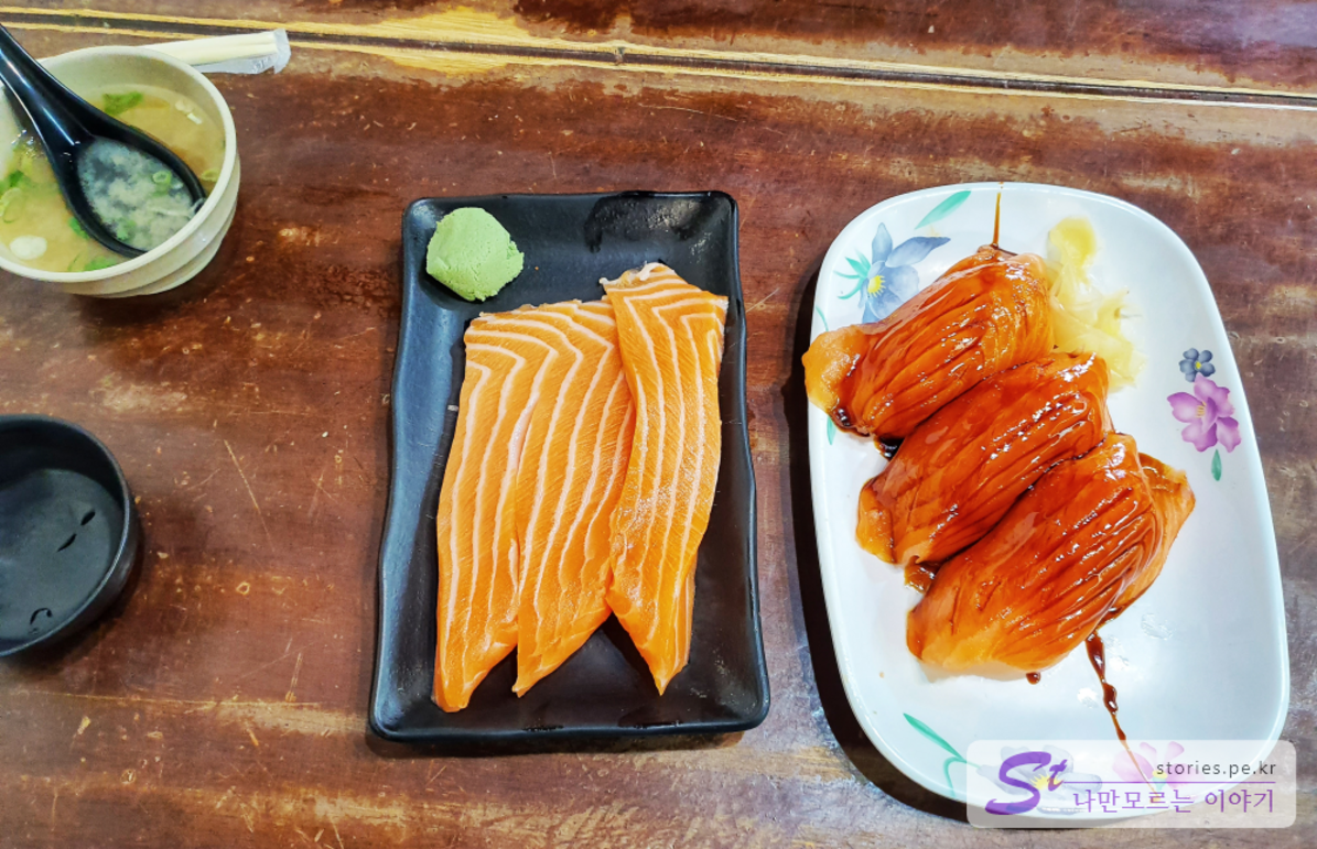 팁을 드리면 포장 손님은 좀더 빨리 연어초밥을 받을 수 있습니다.