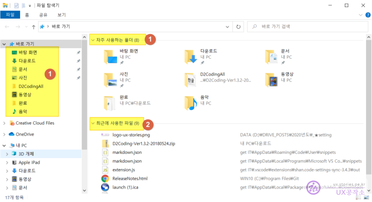 이제 다시 탐색기를 보면 최근에 사용한 파일영역이 사라졌습니다.