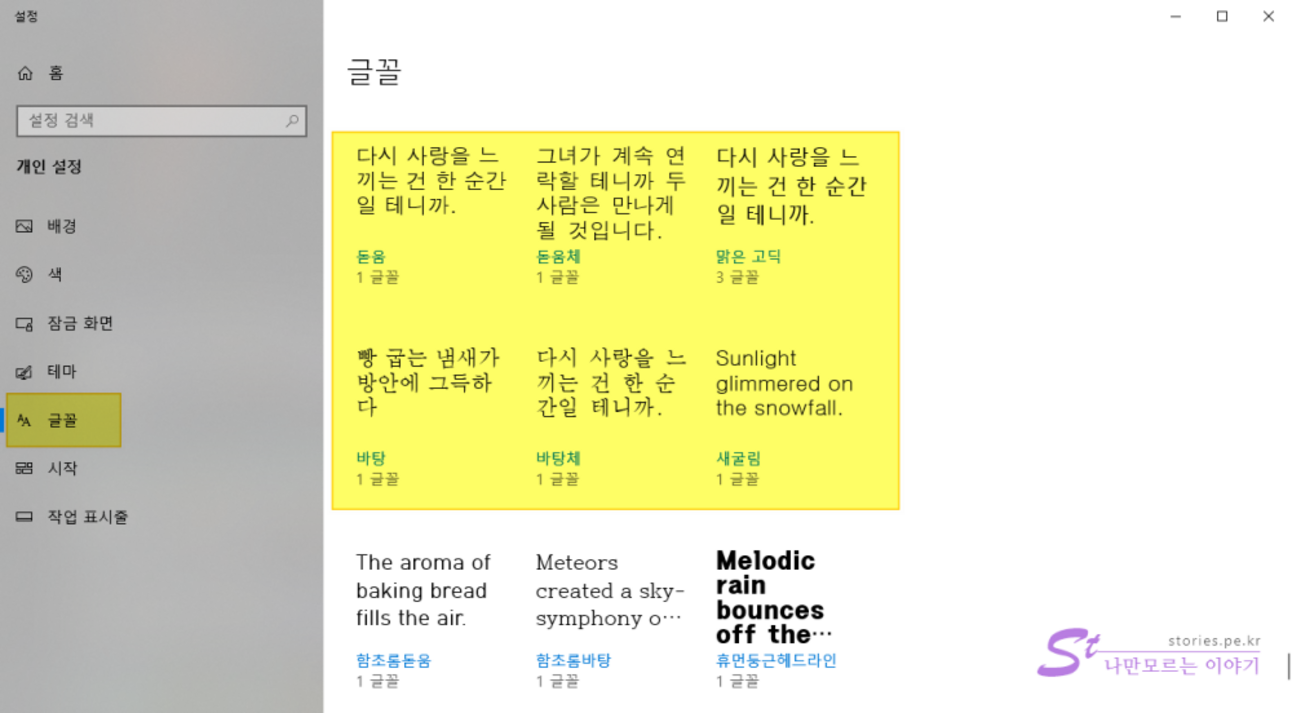 범용적인 폰트는 윈도우OS에 기본적으로 탑재되어 있는 맑은 고딕, 돋움, 바탕, 굴림 같은 글꼴을 사용하는 것입니다.