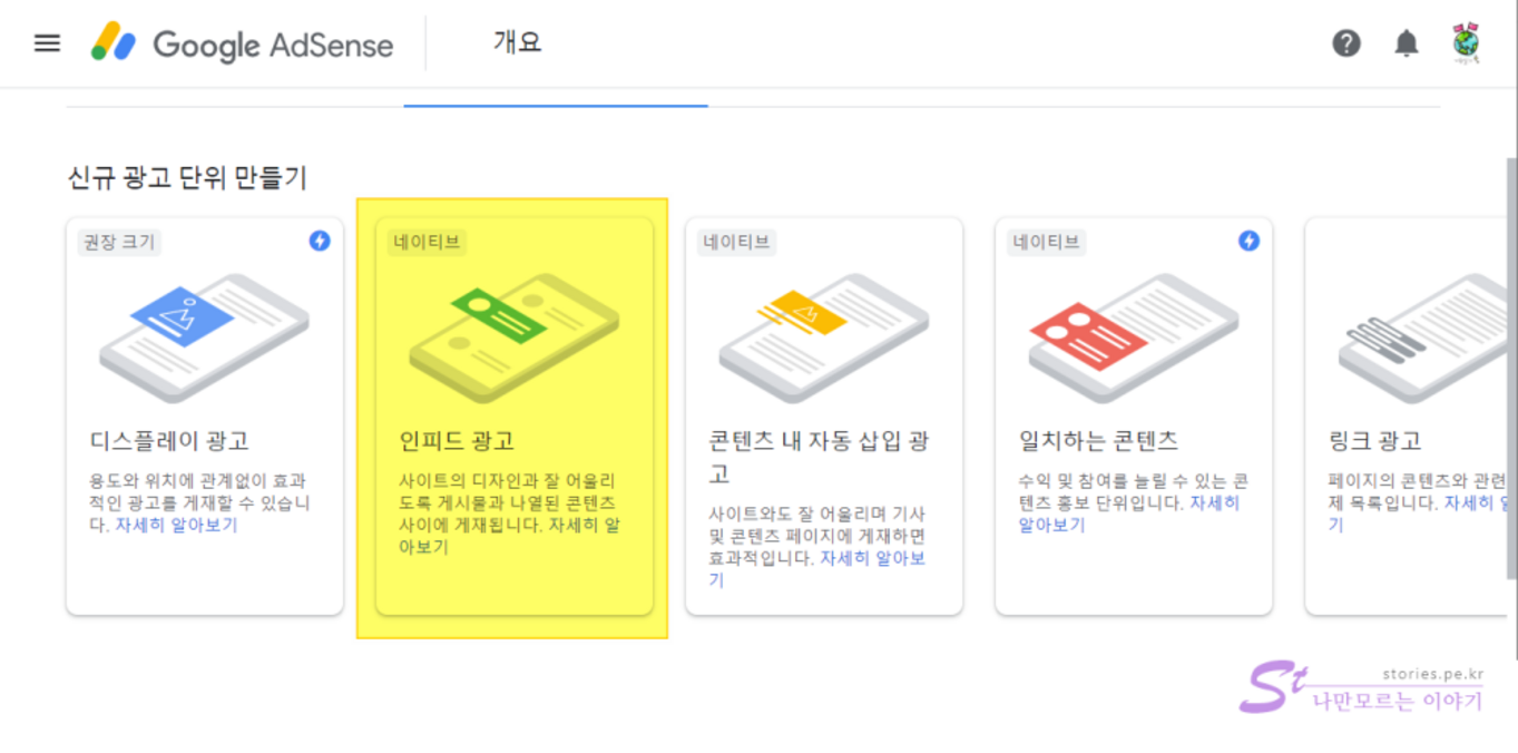 광고>개요를 선택합니다.광고 단위 기준탭을 선택합니다.인피드 광고배너를 클릭합니다.