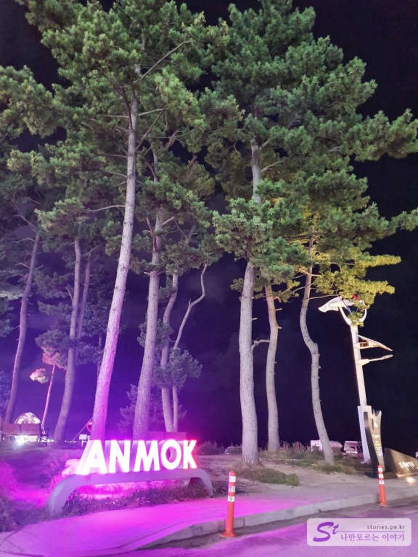 밤에 방문한 안목해변입니다. 안목해변은 여러 곳에 무료로 주차할 수 있는 공영 주차장이 있고 차박을 하는 사람들도 곳곳에 많이 있습니다. 그 주차장 앞에는 이곳이 안목해변이다.라고 알리는 표지판이 있습니다.