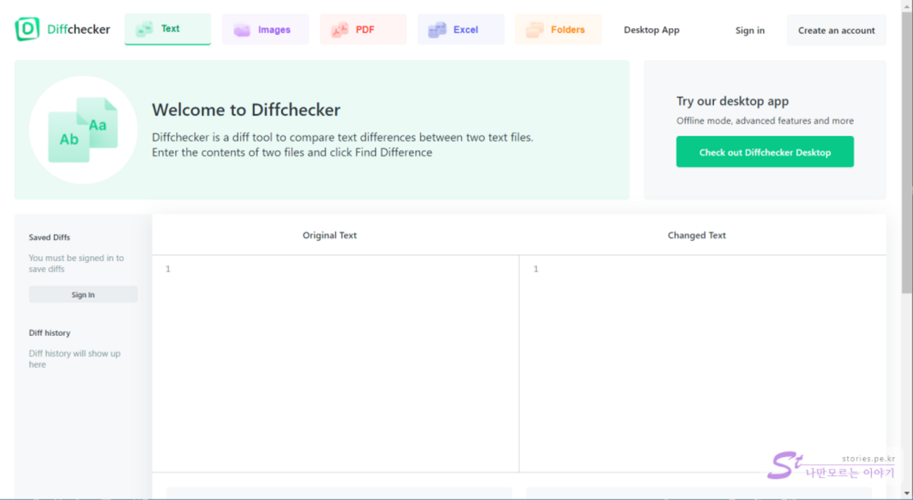 두개의 텍스트, 이미지, PDF, 엑셀, 폴더를 비교할 수 있는 Diffchecker 웹서비스