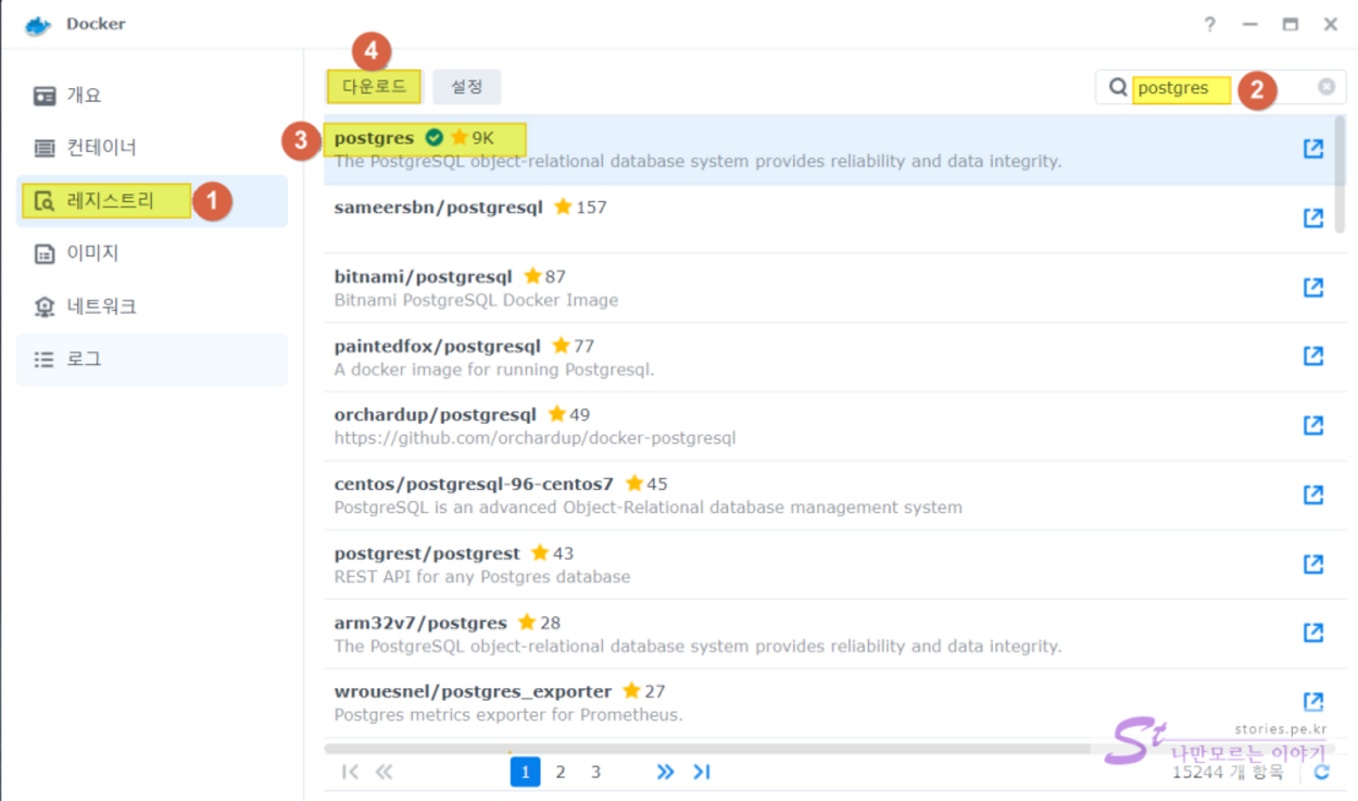 먼저 postgres Docker 이미지를 다운로드하여야 합니다. 아래의 화면에서 찾아서 다운로드하면 됩니다.