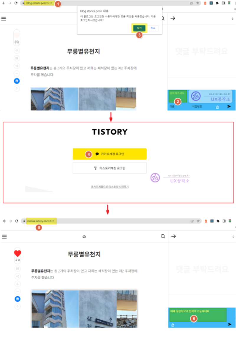여기에서 중요한 점은 비로그인 상태에서 로그인 상태로 전환되는 구독하기, 댓글 쓰기 버튼을 눌렀을 때 자동으로 1차 도메인(티스토리 도메인)으로 전환해서 로그인을 하는 것이고 로그아웃 버튼을 클릭했을 때 로그아웃 후에 다시 개인 도메인(2차 도메인)으로 전환하는 것입니다.